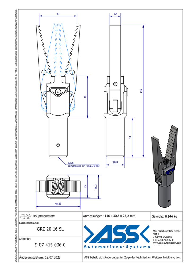 Pince Ø20mm, piston Ø16mm, mors allongés en dents de scie